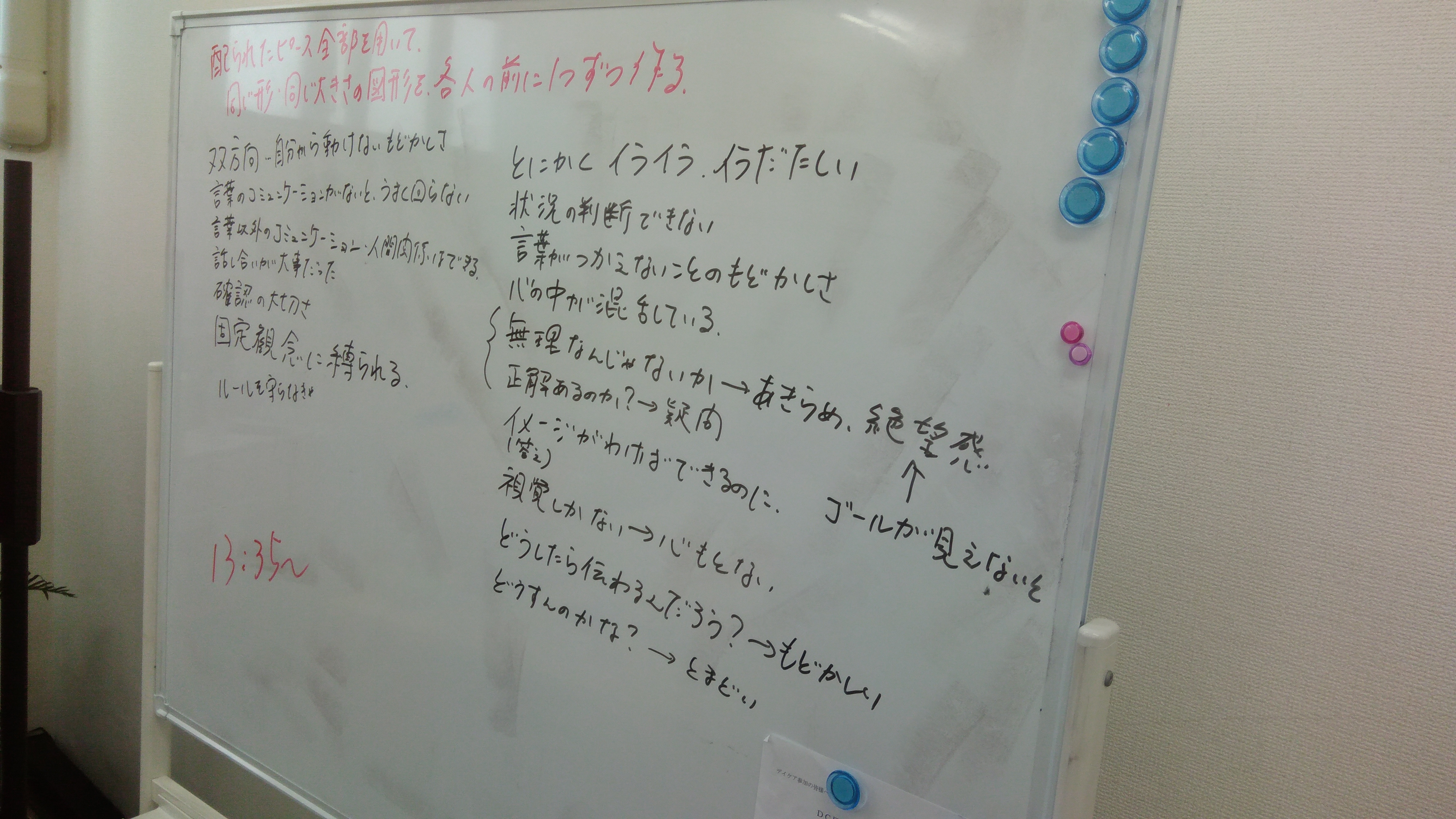 今日は無言で協力し合いながら、パズルのピースを合わせていき、全員が同じ形、同じ大きさの図形を作ることを目指す、というワークを行いました。