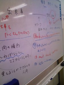 その後、自分の抱きやすいイラショナルビリーフを考えました。そして、それをラショナルビリーフに変え、自分の抱くビリーフについてわかちあいました。仕事上やプライベート等、様々な場面で抱いてしまいがちなイラショナルビリーフ(「ミスをしてはならない、ミスをしたらダメ人間だ」「人ができることが自分もできなければならない」、「他者の思い通りのことができなければならない、それができない私はダメだ」等)について様々な視点からわかちあいました。そして、それを少し和らげたり、エスカレートさせずにラショナルビリーフに変えていくこと等について確認しあいました。人間は、物事を「~ねばならない」とエスカレートさせがちです。ただ、そのエスカレートさせたものを程よいものに変えることができるのも人間です。