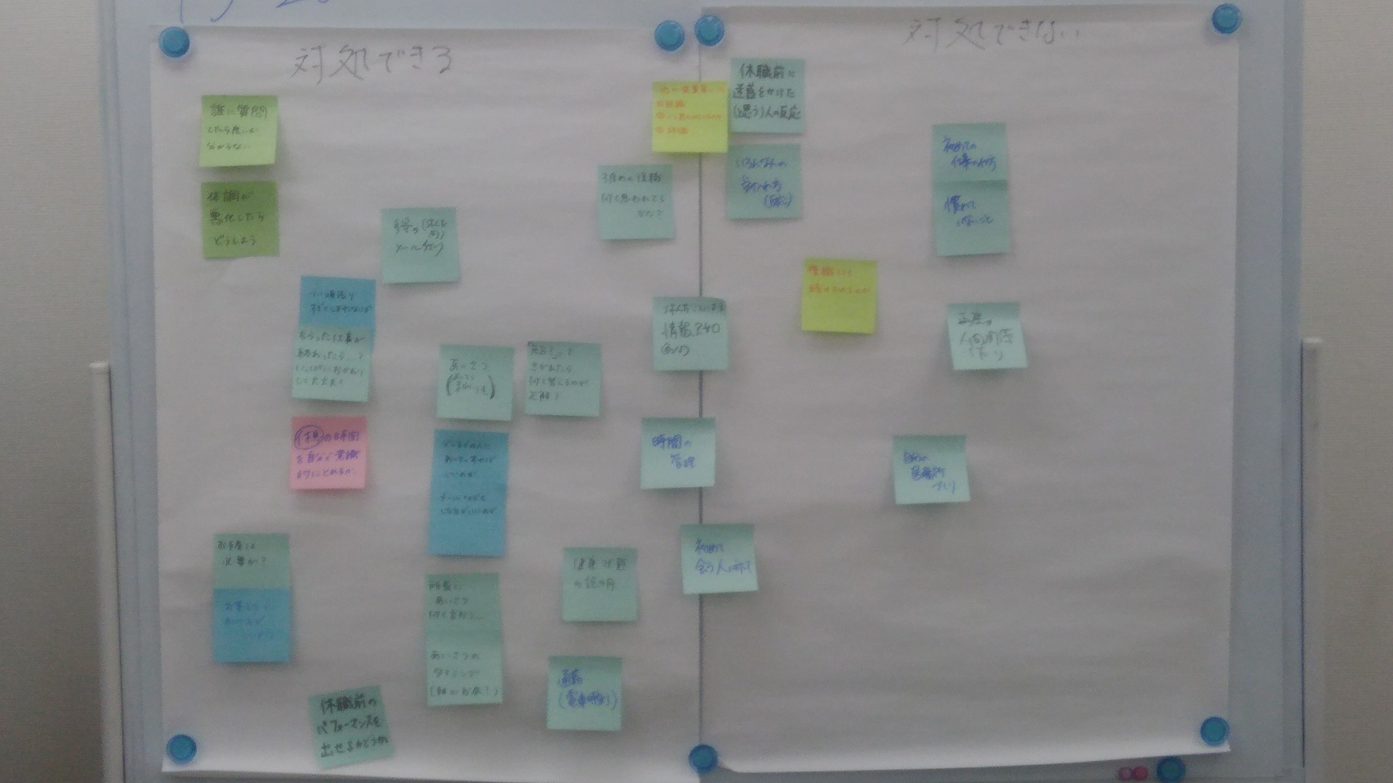 今日は復職支援プログラムということで、復職初日のトラブル・シューティングを行ないました。どんなに準備をしても、あるいはしっかりと準備をしてきたからこそ不安はどうしても出てくるものです。それをみなでリストアップして、対処できるもの、できないもの仕分けてみました。