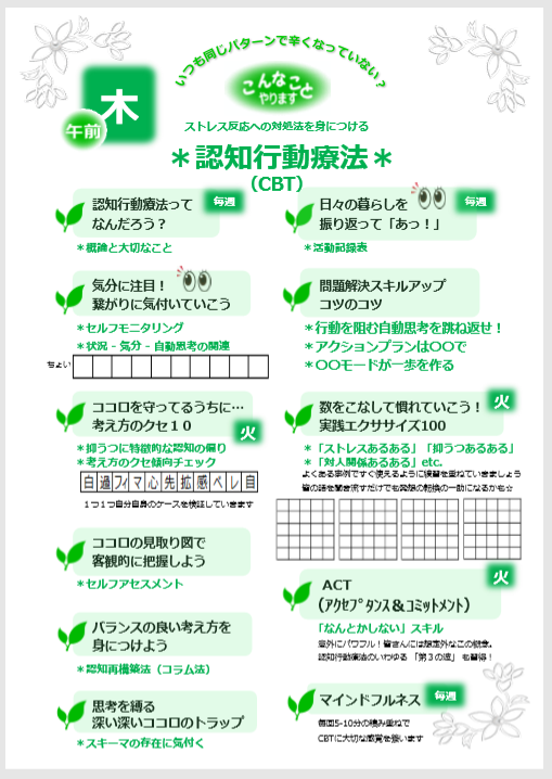 今月から毎週木曜日は認知行動療法(CBT)を実施することになりました。