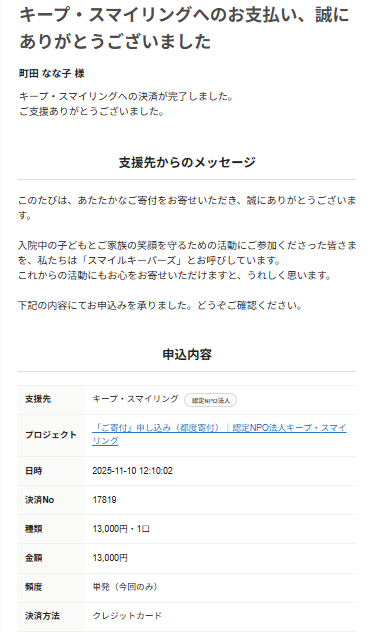 「認定NPO法人キープ・スマイリング」にオンライン寄付をしました
