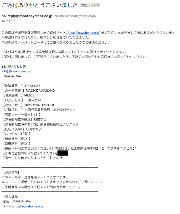 埼玉県さいたま市緑区の児童養護施設「ホザナ園」にオンライン寄付をしました